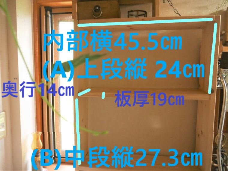 上段(A)ふつうのハードカバーサイズ用、中段(B)少し大き目ハードカバーサイズ用の本棚としてつくったもの。