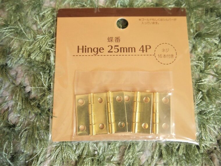 扉を留める金具は、【セリア】蝶番25㎜4P ゴールドを用意。