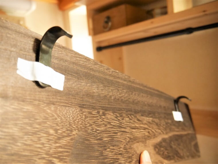 まずはマスキングテープでセリアのJ型フックを板に仮留めして、