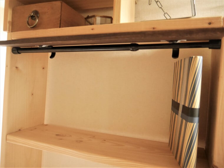 つっぱり棒を、本棚内側上部に、仮留めしてみます。