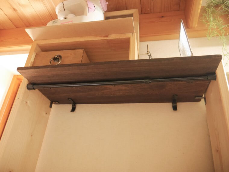 フックでひっかけた板が落ちてこず、上に空間が開きすぎない状態でポールが回る位置を探します。