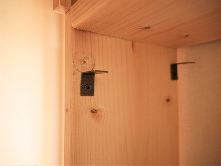 あとで扉が内側に入り込んでしまわないようにと、開閉するときの取っ手がわりに、L字金具もつけました。