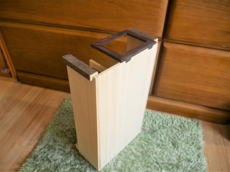 一か所しかとめていませんが、セリアの檜ブロックは4.5×4.5㎝の安定感があり、自重で木箱がちゃんと載っています。