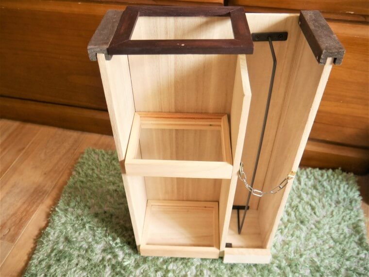 左右の木箱につけたダーク色の木枠は、セリアのインテリアウォールバーを12㎝ずつにカット、くぎうちしたもの。(以前の工作では脚部分としてつけたのでした。)