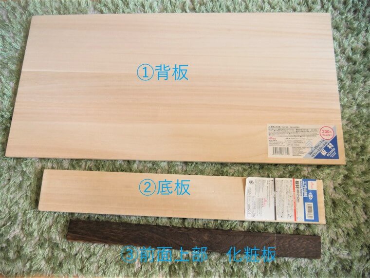背面板もとめますよ。ただダイソーの定型板材だと、幅が脇板厚み分だけ、背後からビスどめするには足りず。