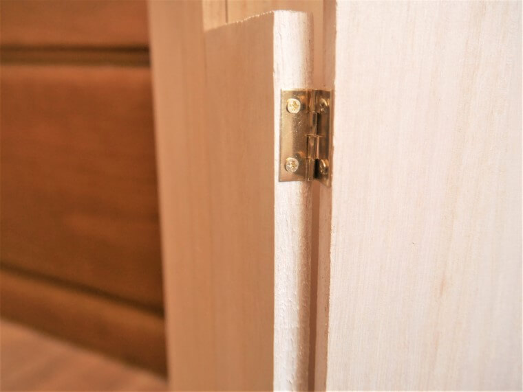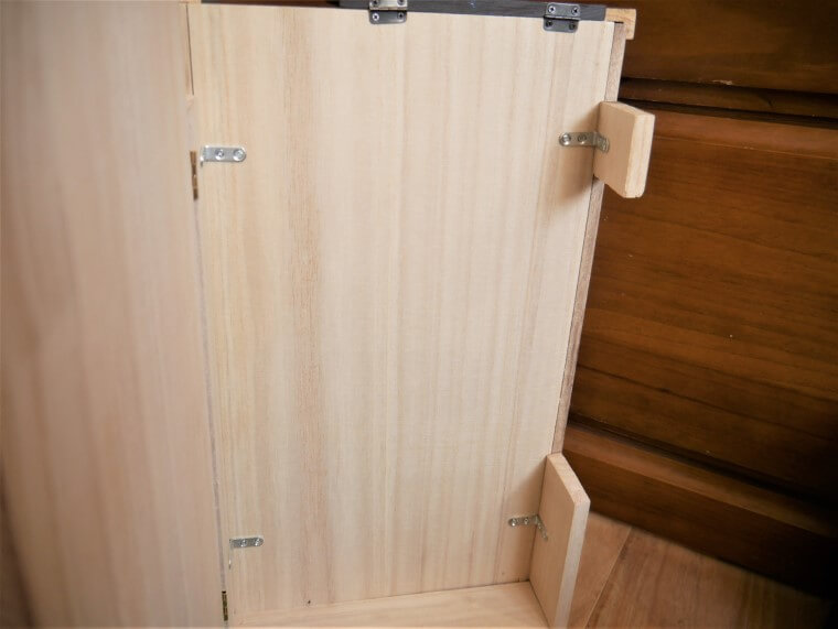 右の仕切り前、板がずれてこないようダイソーのブロックタイプの工作材料を前面に蝶番で取り付け。