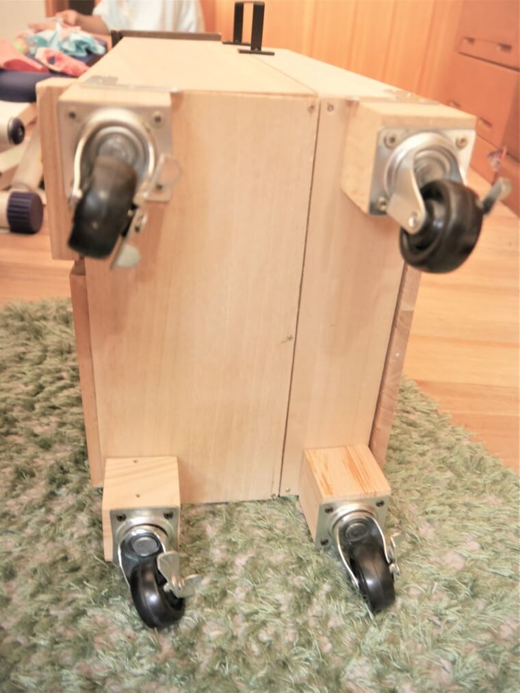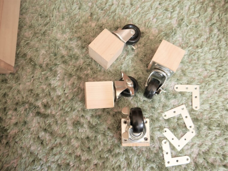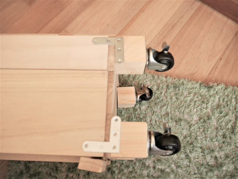 下の車輪は以前別のDIYでつけていたもの。セリアの檜ブロックに取り付けた一個につき耐荷重20㎏のストッパーつきキャスターです。