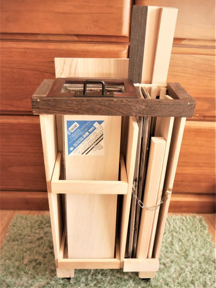 木枠は収納した板が前にずれてこないように、取り付けたもの。