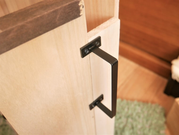 カートを持ち上げたり、引き出したりするとき、収納木箱のふちをつかみくいと思ってつけたこのとって!