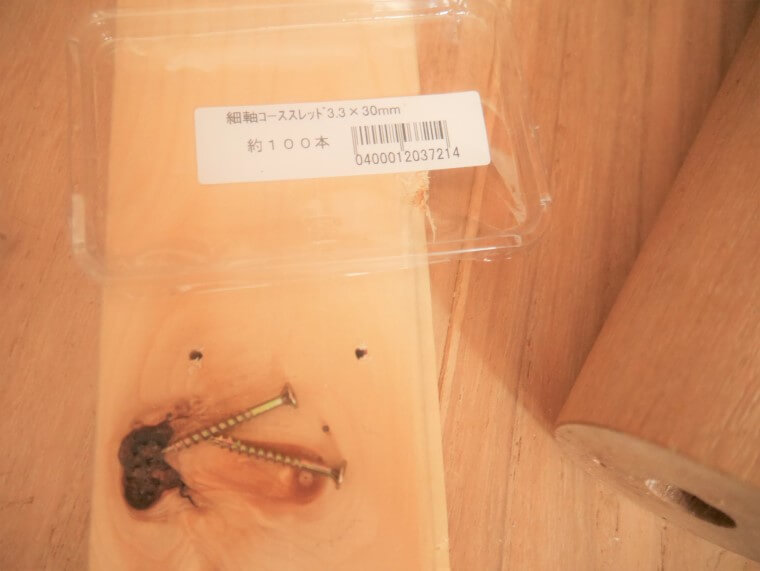 まず最初に、土台脚に円筒形木材をビス打ち。細軸コーススレッド3.3×30㎜を使用。