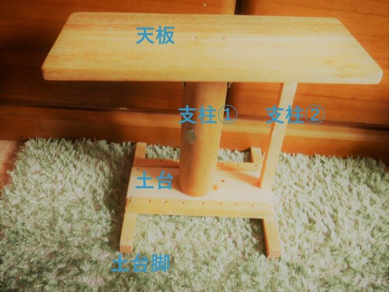 支柱①は太いので、脇の支柱②はほぼ飾り。天板横に長めのため、バランスを保つ意味で置いております。