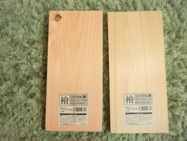 近所のセリアの資材売り場、となりの棚にもう少し細目の檜板もありましたが、幅広めの方が安定感があるため、こちらを採用しました。