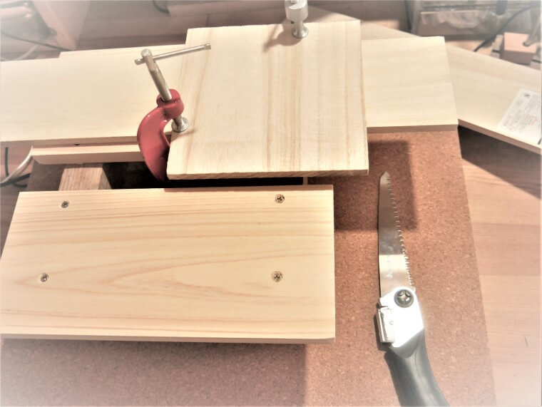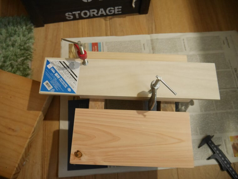 天板のセット位置を決めるため、ダイソーC型クランプと切りたい板(サンプル)を仮に挟んでみました。
