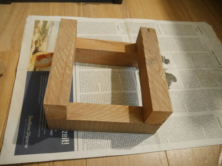 今回、木材はこの3カットのみ。角材が大きいので、いつもの手動カッターではなく、ふつうののこぎりで庭の廃材竹の上で切りました。(両刃のこを使うのは初めて。)