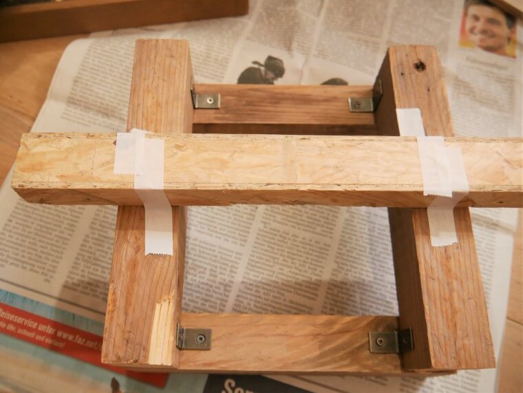 木工用接着剤を使うと、二度と作りかえることができなくなるので、今回もセリアミニステーで内側から固定することにします。