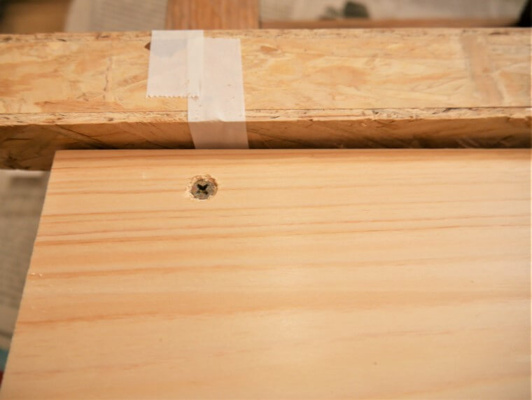 下穴ドリルで最初に下穴を開け、皿頭が天板表面から埋没する大きさの穴を開けてからうちました。