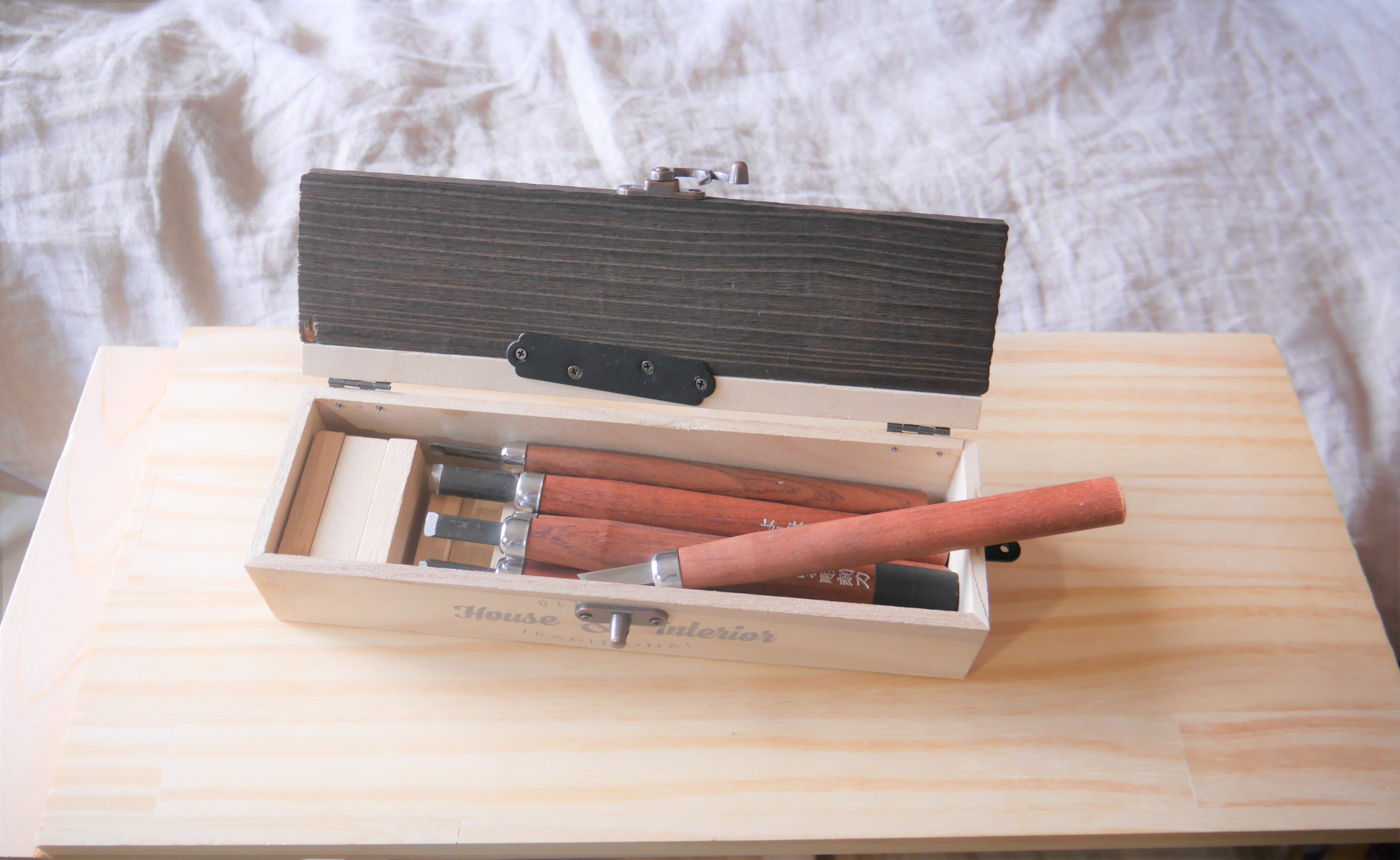 彫刻刀入れ(しょぼいボール紙)が劣化してきたため、おしゃれな木箱に入れたい!でもぴったりサイズの市販品がない…それが最近の小さな悩み。