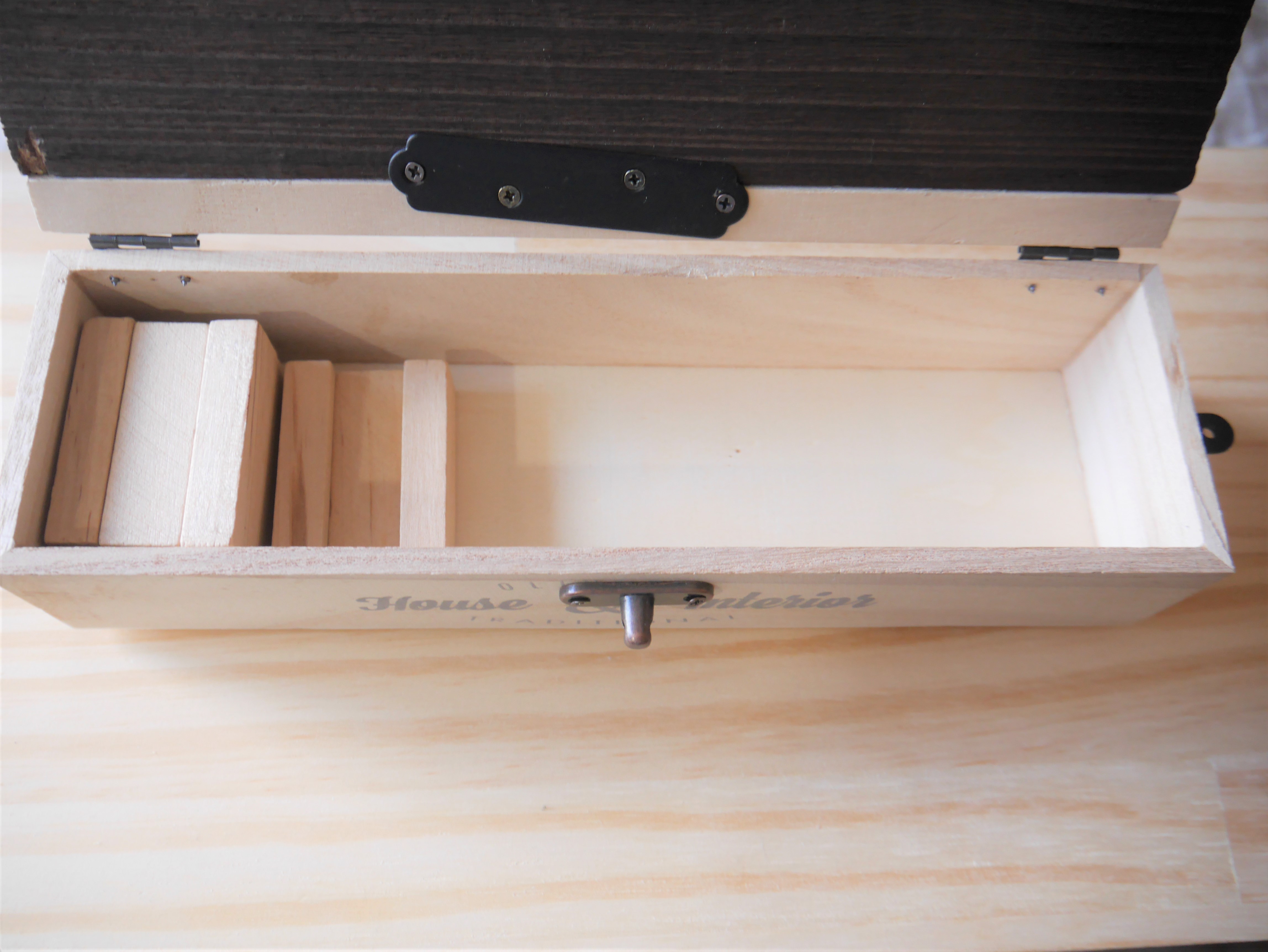 いちどセリアの木製トレイロングLを二つ合わせ鍵つきボックスにしたのですが、彫刻刀入れにしては蓋が大きすぎ。