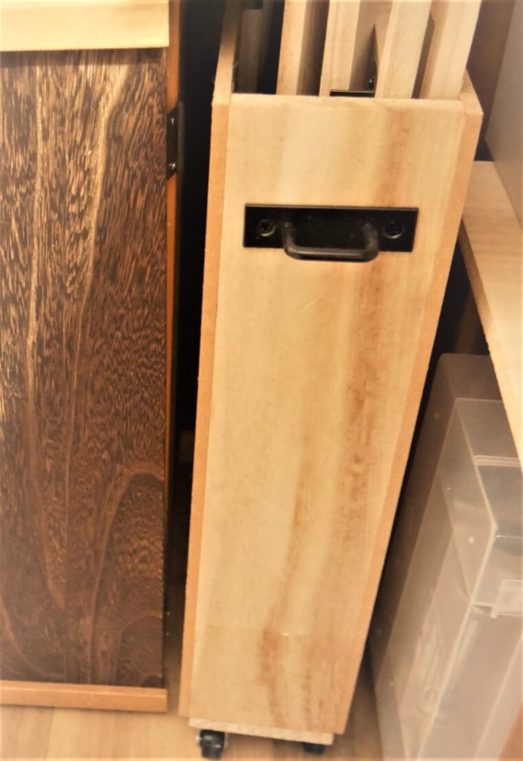 引き出しにくい、狭い場所に押し込んだ、隙間家具的収納カートには、こうした小さめハンドルをつけるのもおすすめ。