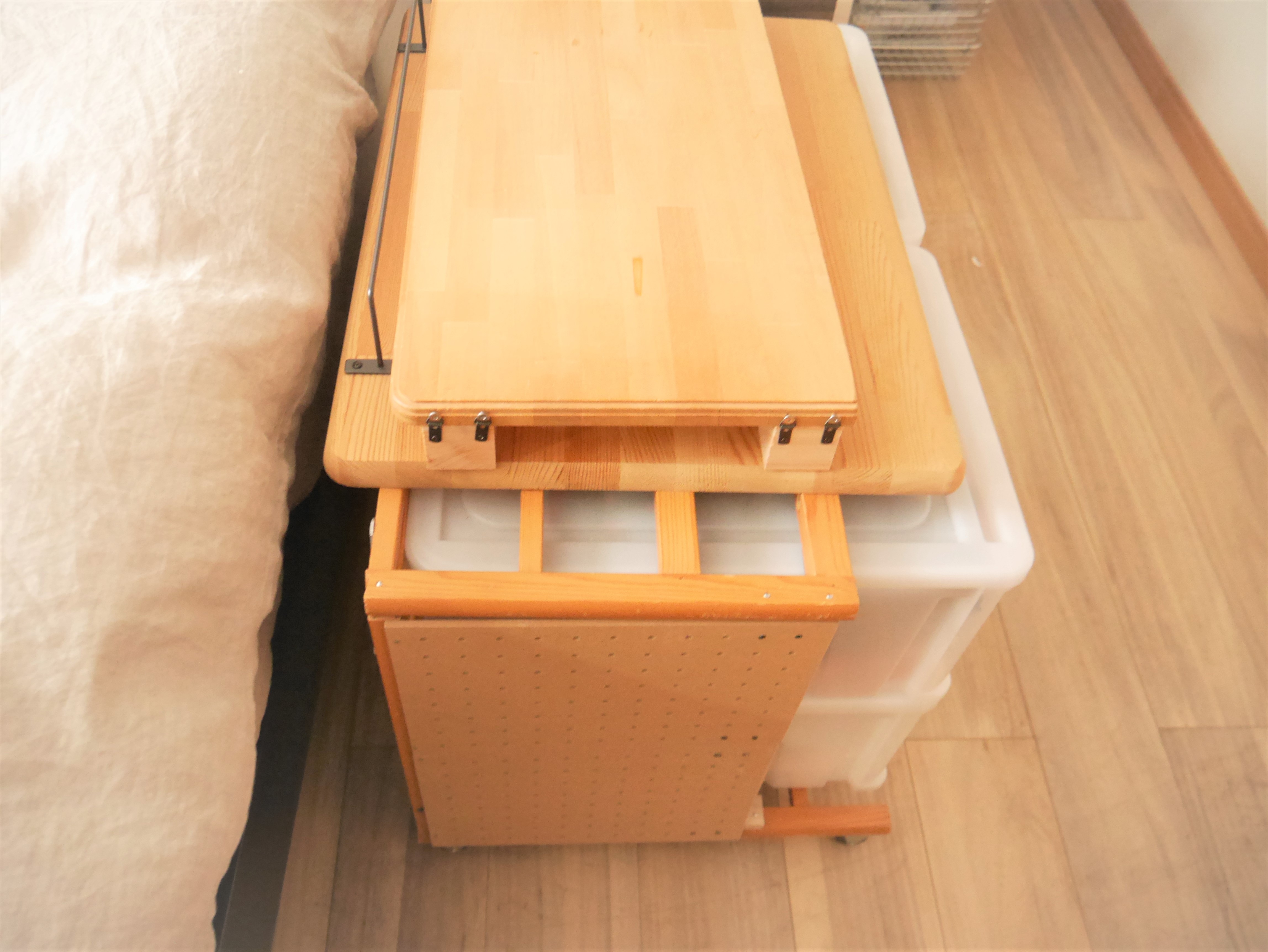 見ての通りベッドの布団の上とほぼ同じ高さになるプラケース収納で、