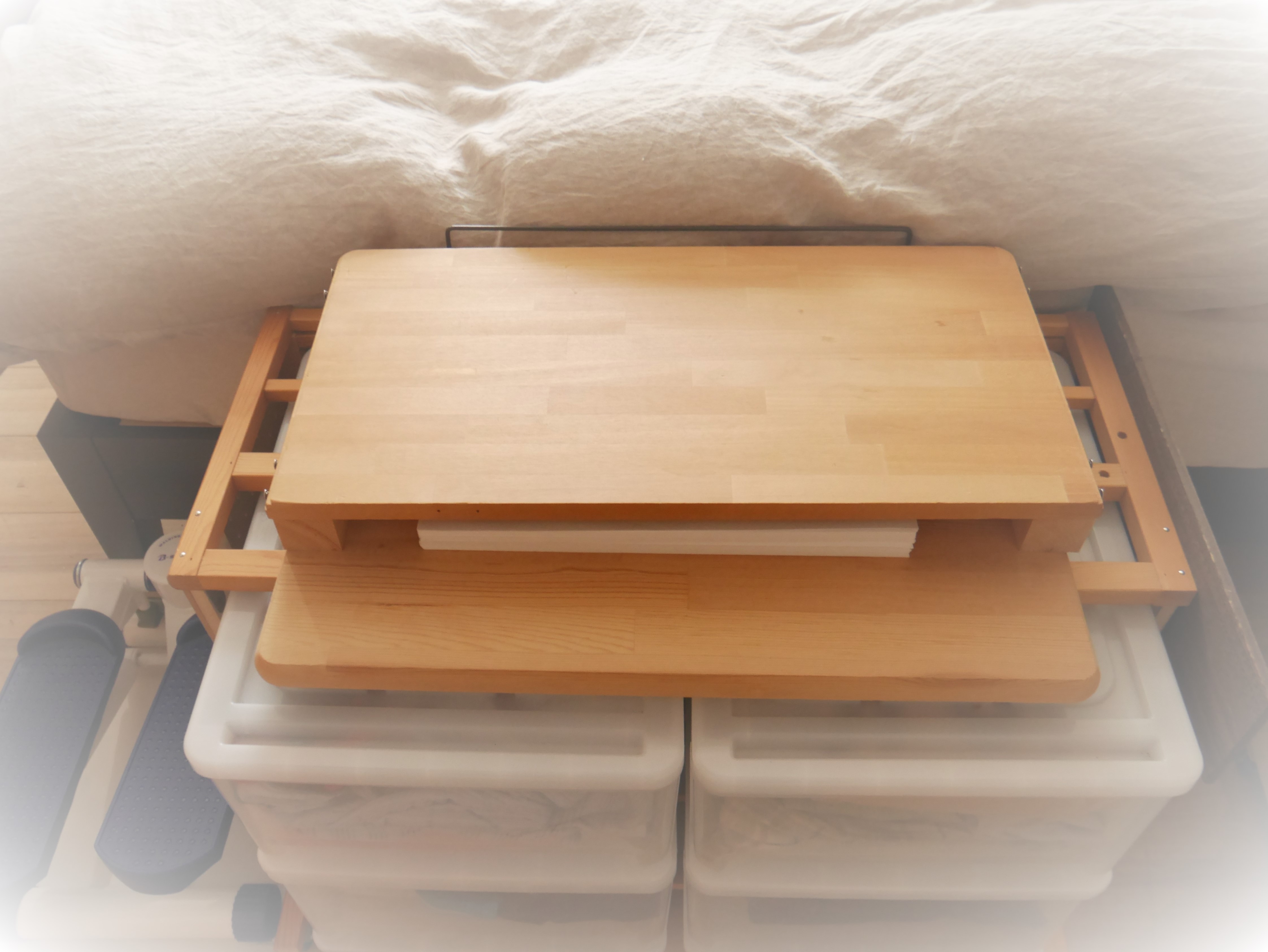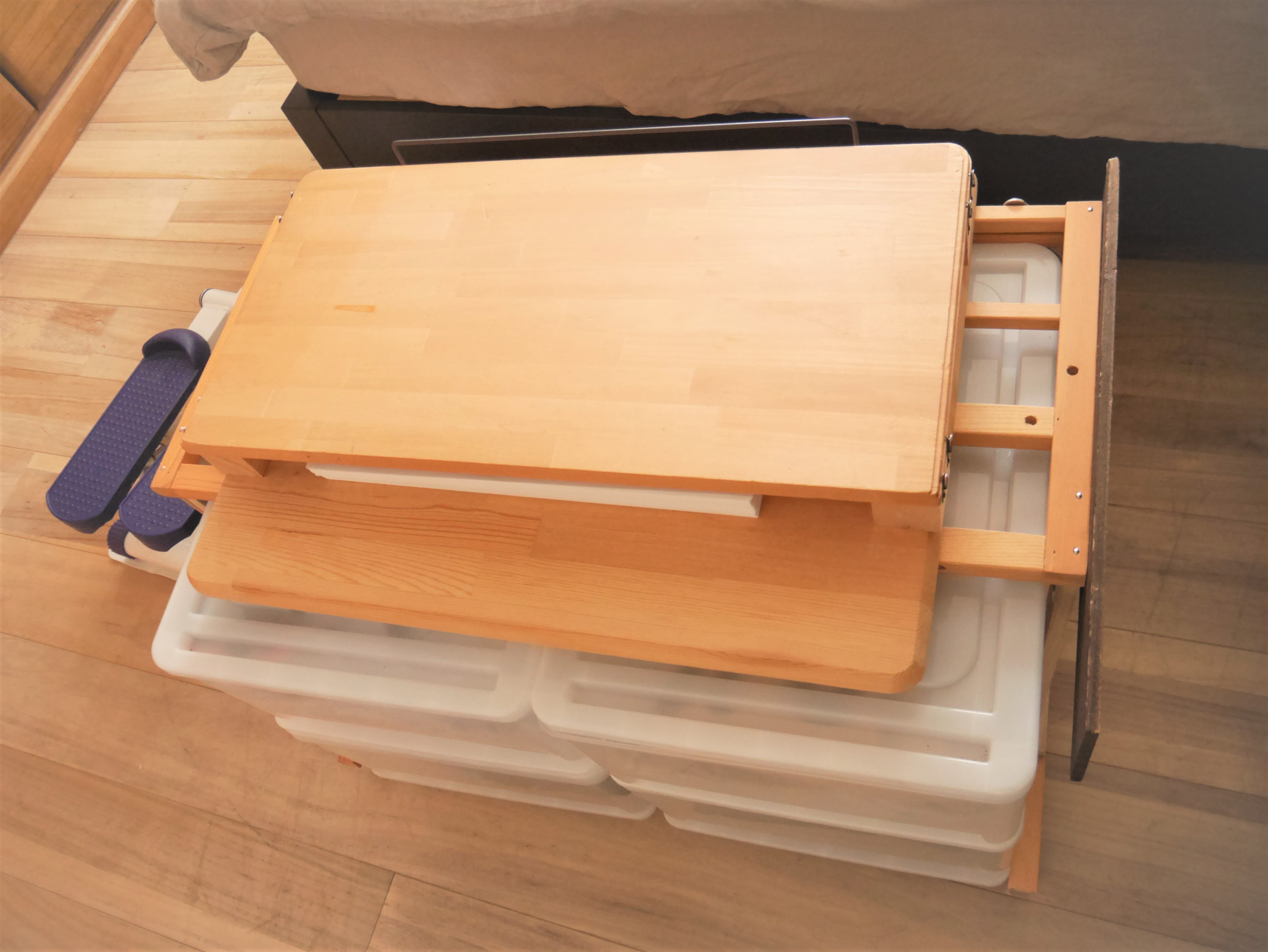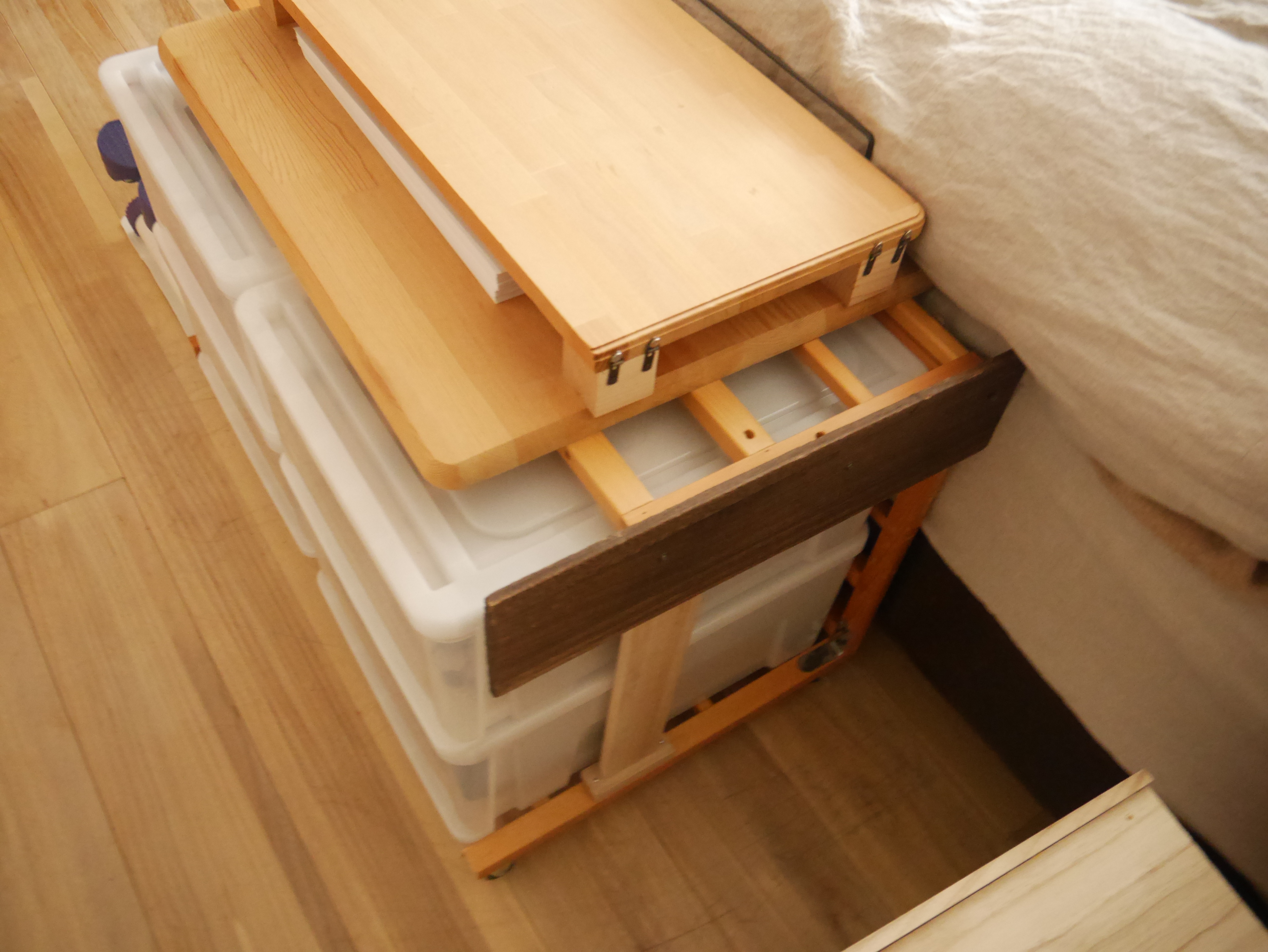 余談ですが、この下のカートはニトリのプラケースを四つ入れこんでまして、自作したベビーベッド廃材品でつくったカートで、床を楽に移動できるようになっております。