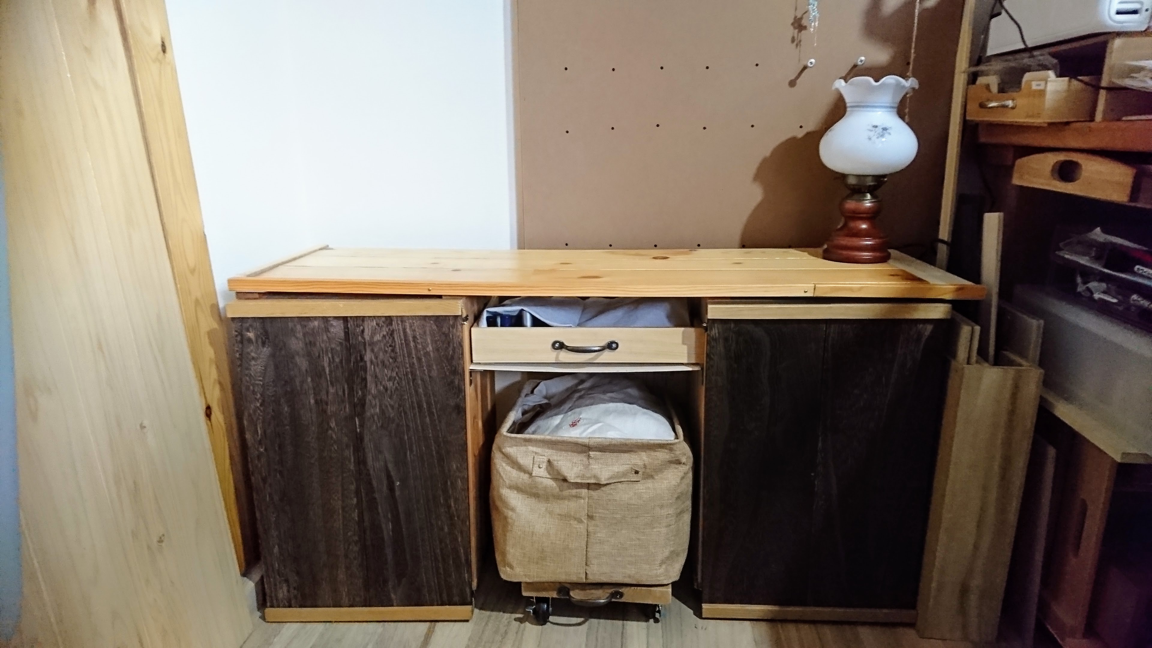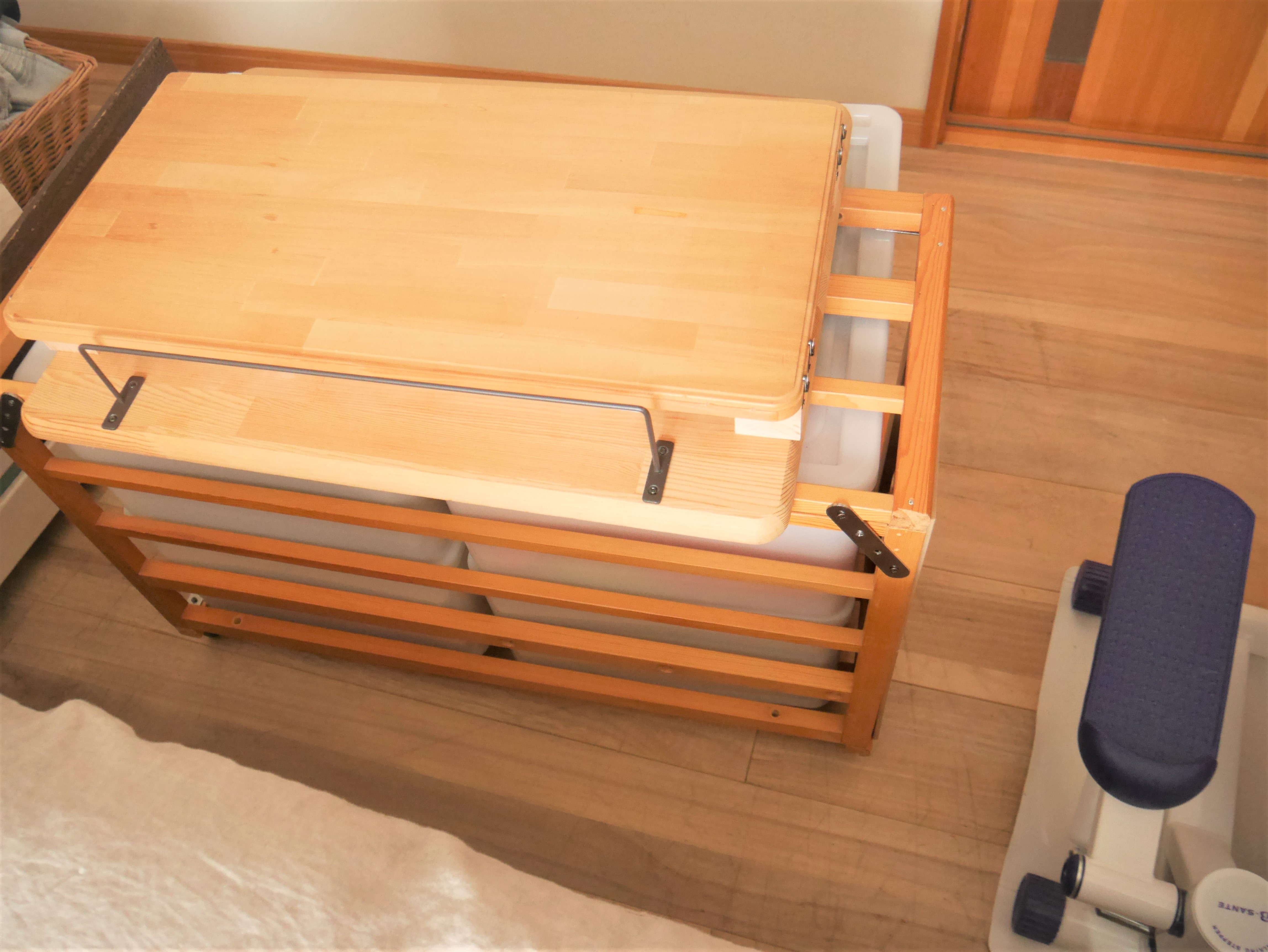 とりあえず、ニトリプラケースを収納するため自作した木製カートがあるので、その上に置くだけにします。