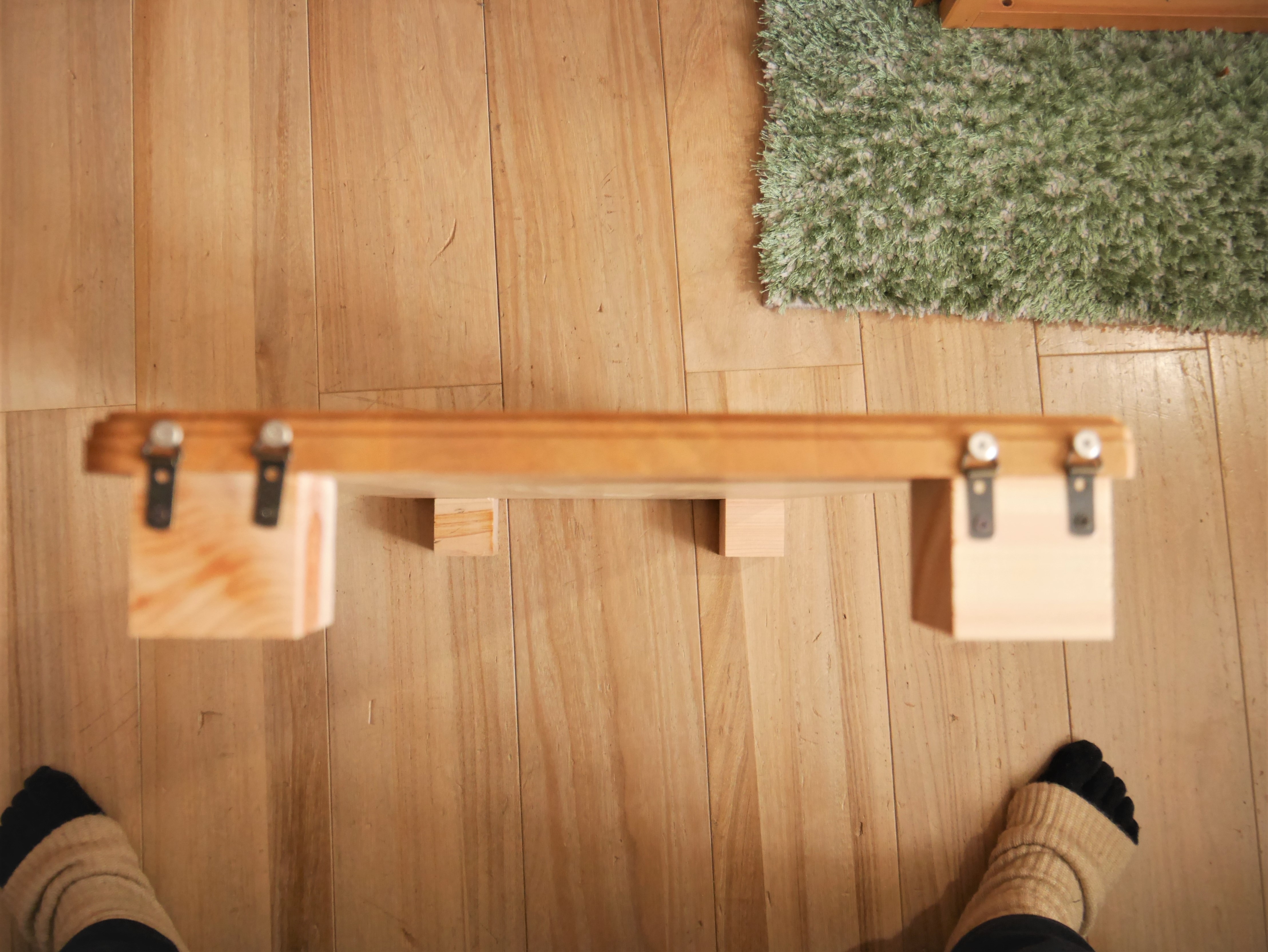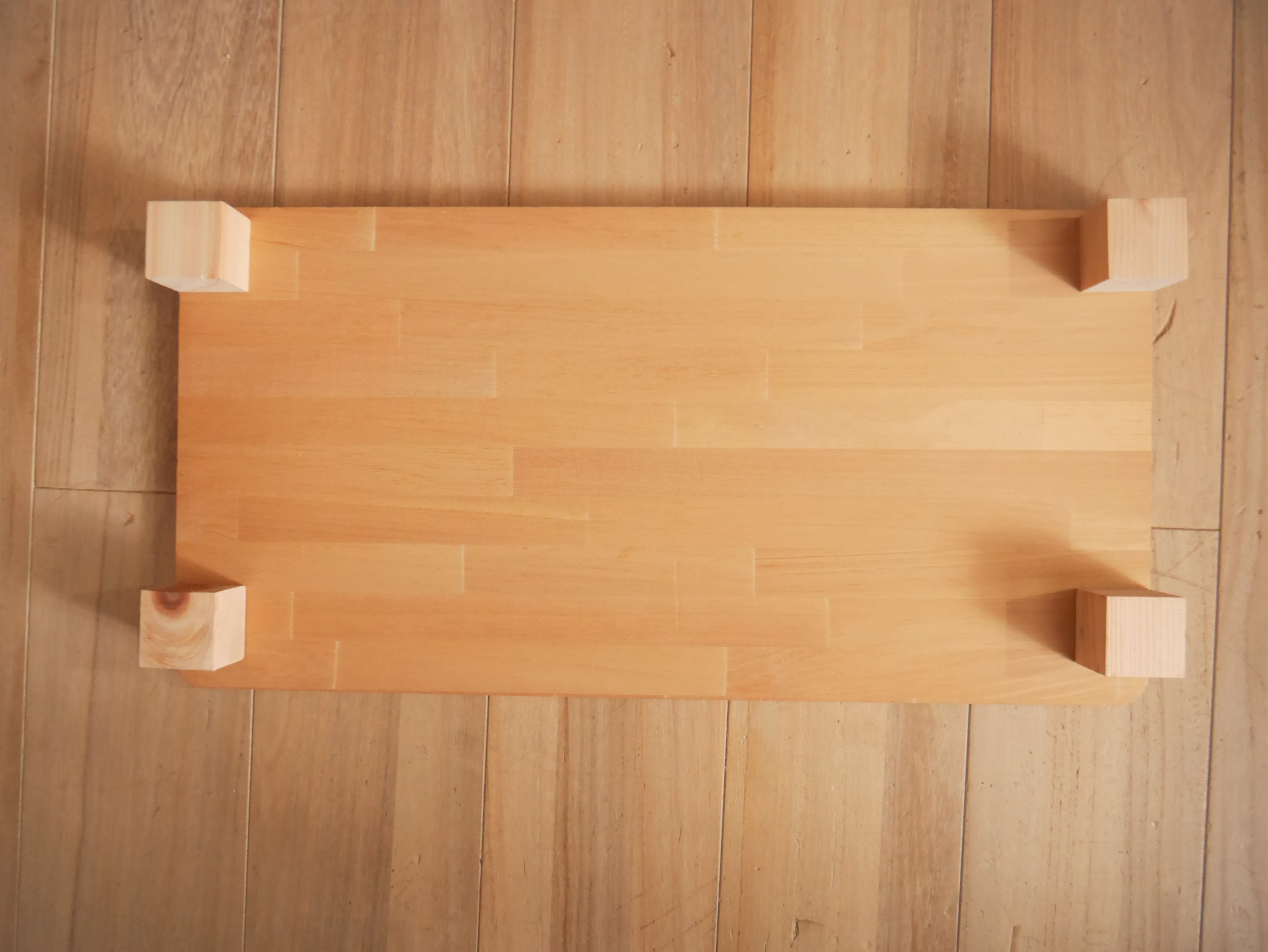 セリアでは材質が檜。桐と違い、適度に重量もあり、天板の自重だけでも足には安定感がでます。