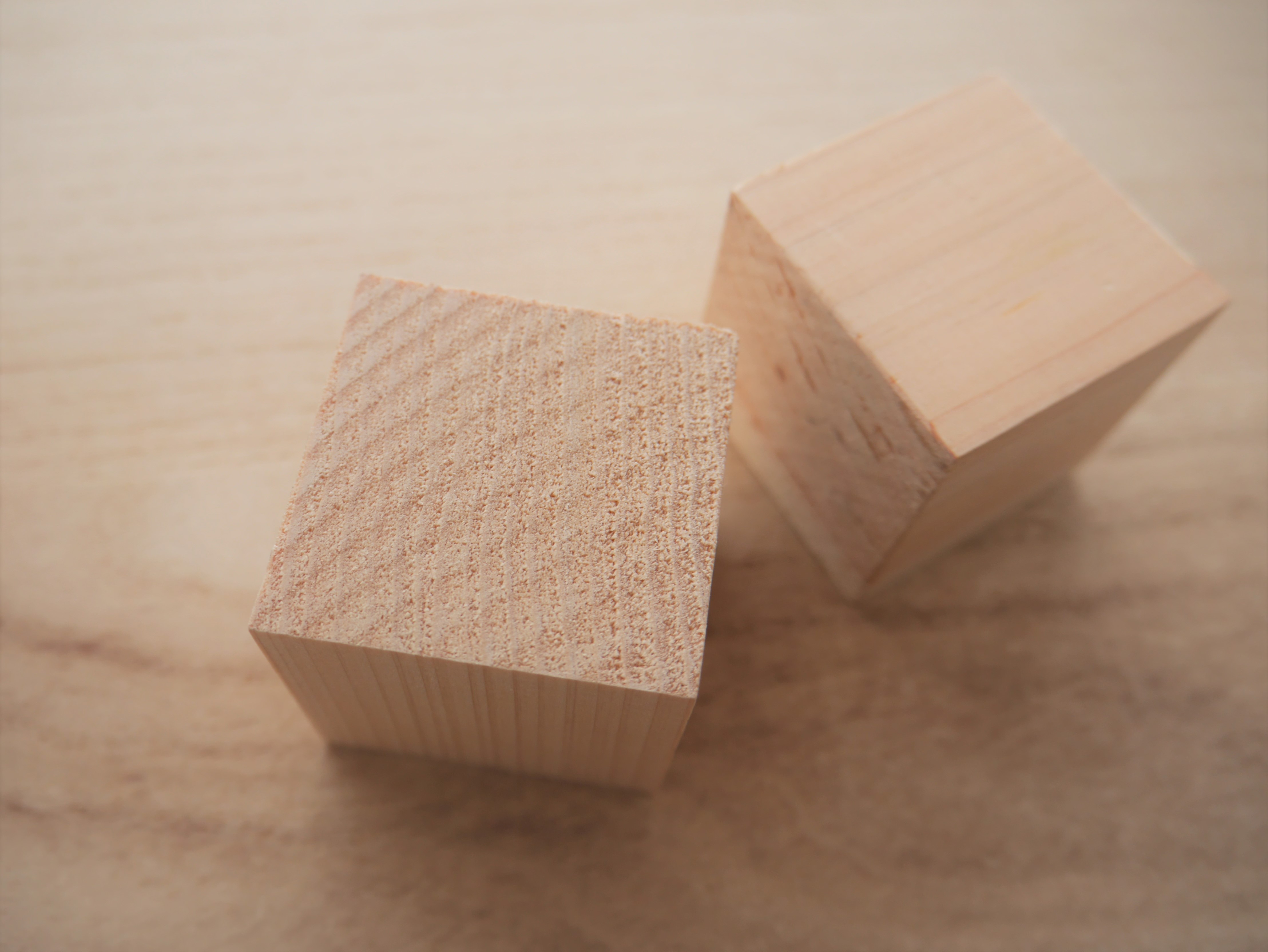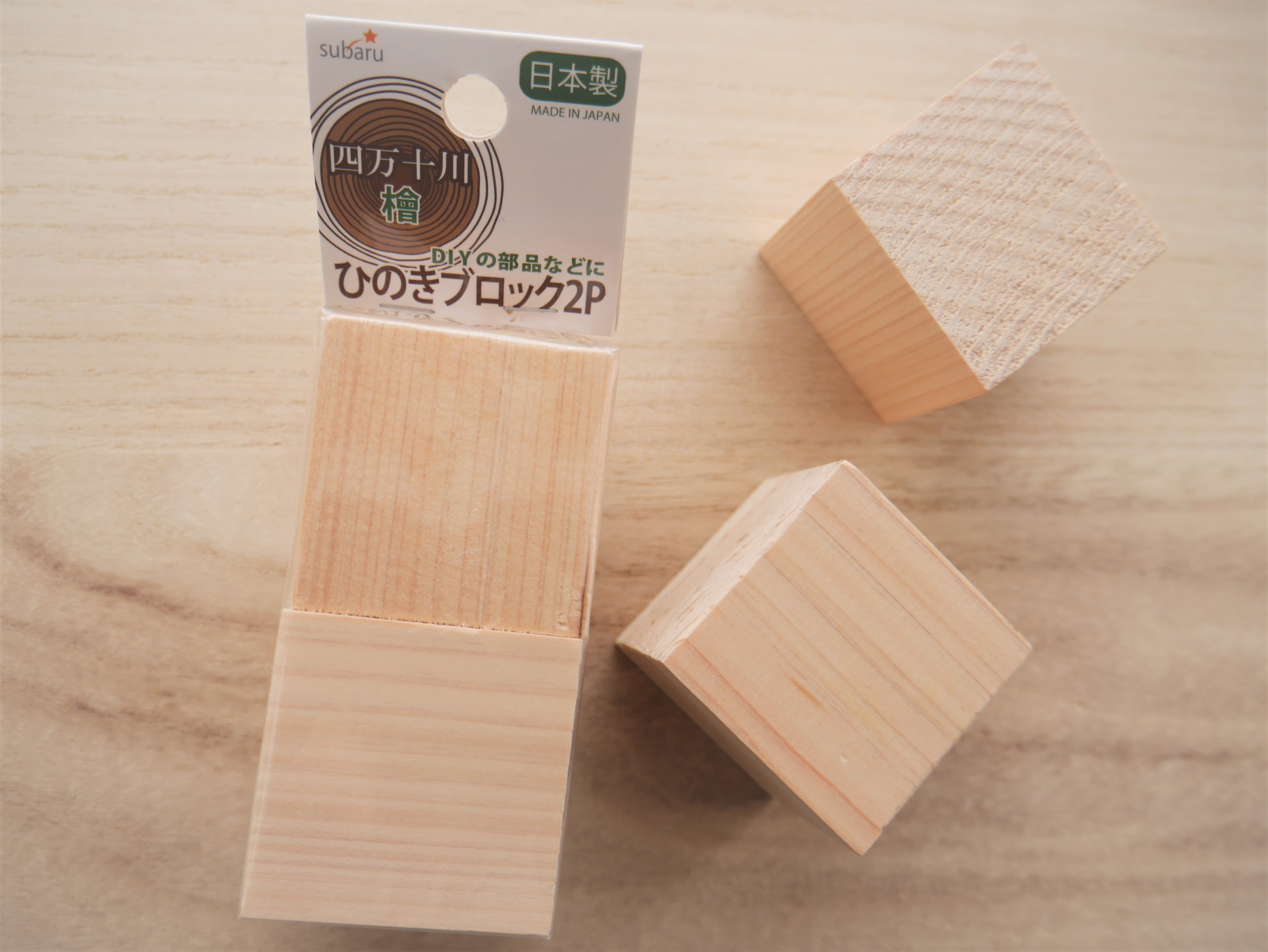ダイソーでも木製ブロックはありましたが、桐製1個売りで大きさがセリア品より大き目。やはり一辺45㎜立方体がちょうどよい大きさ、しかも2p売りで便利です。