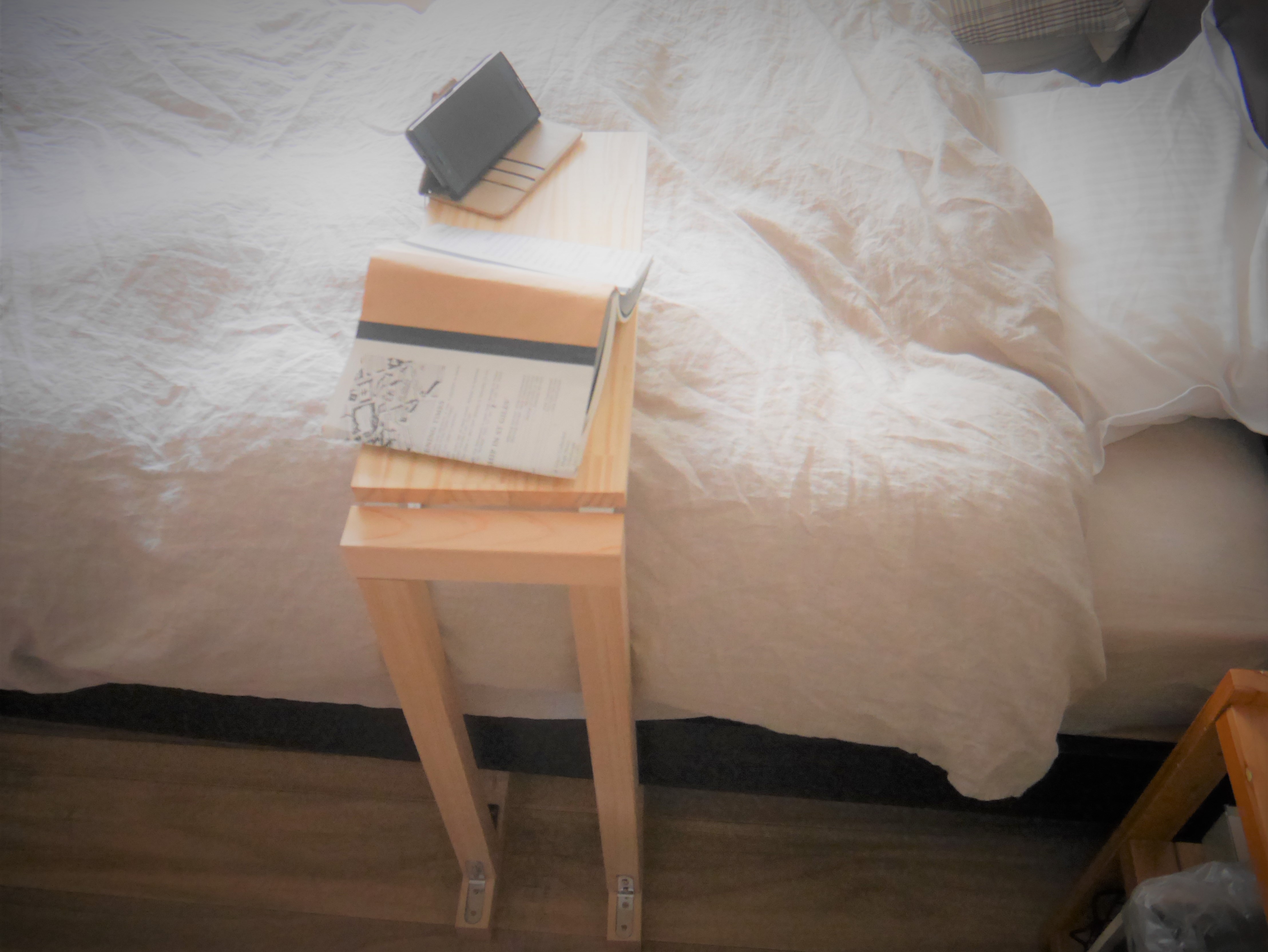 今回の折りたたみ金具をつかって、ベッドサイド脇に最適なサイドテーブルを自作する、