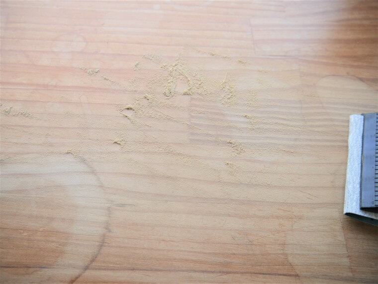 ときどきサンドペーパーに目詰まりが起こり、気づかずこすりつづけると、天板に筋が増えています。