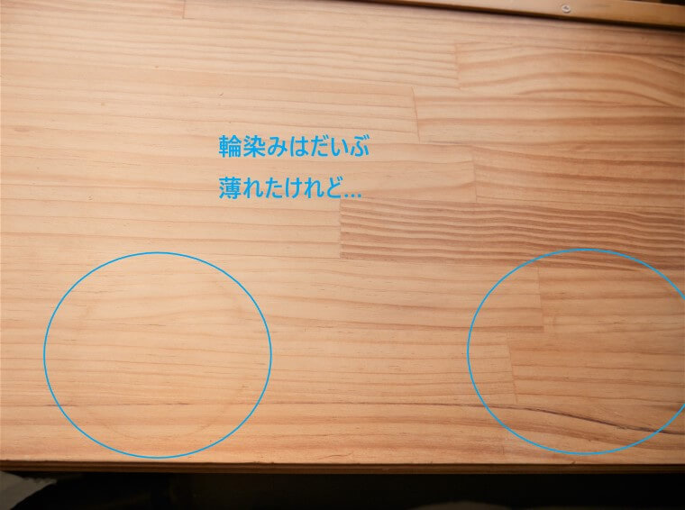 地味に木目に沿って、輪染み部分を含め、天板全般をなんども往復させます。