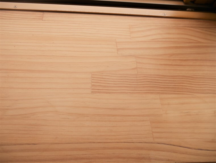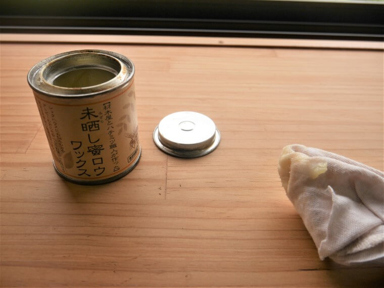 天板は少しはちみつ色がかるのですが、かんたんにつやが出てすべすべになるので、蜜ロウワックスはお気に入りです。
