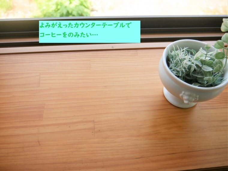 つくりつけカウンターテーブルなので、外に出してカンナで削るとか、業者に依頼等大胆なことがしにくいです。